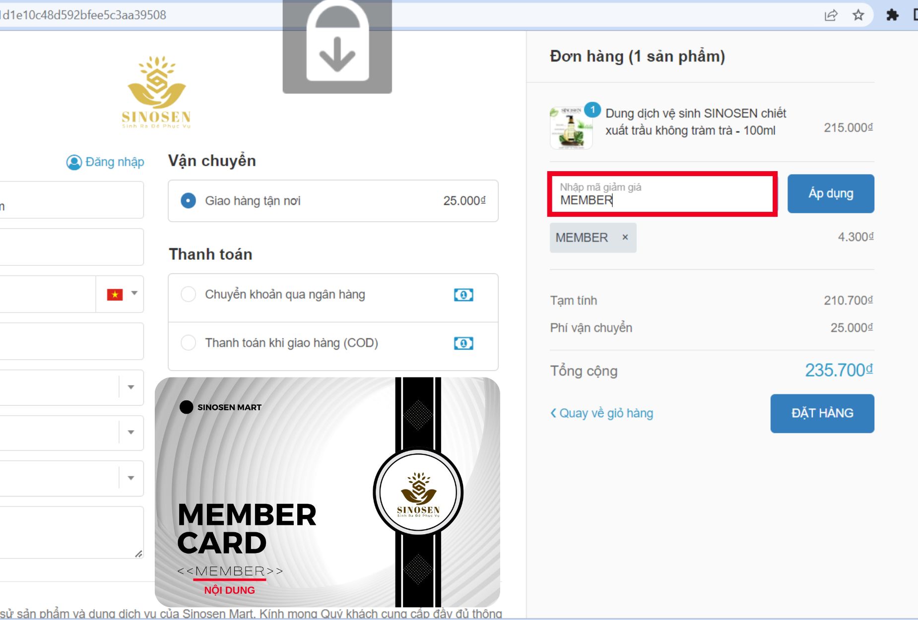 - Quý khách vui lòng nhập mã cho mỗi lần thành toán để hệ thống kiểm tra danh tính khách hàng và cấp bậc thẻ. Quý khách quên nhập mã vui lòng liên hệ với BQT web nếu đơn đã được hệ thống xác nhận để hổ trợ. Riêng đơn chưa được hệ thống xác nhận thì khách hàng có thể hủy và thao tác đặt đơn lại sau đó nhập mã.